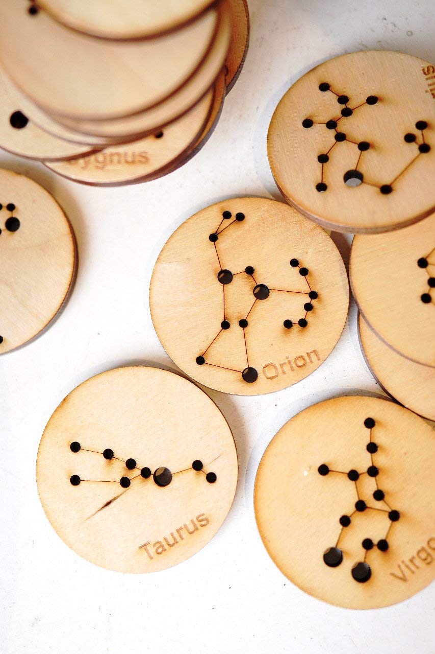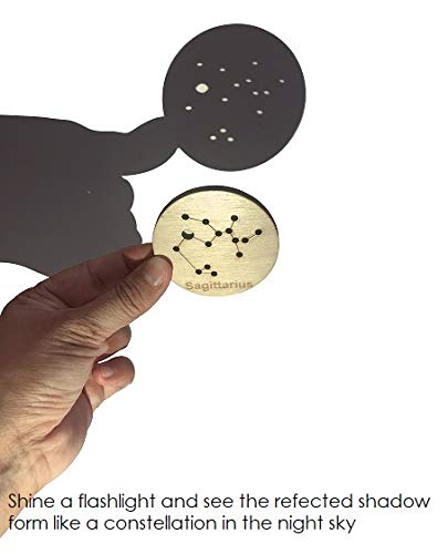 Bring the night sky alive into your home by projecting a torch through these coins towards your walls or ceilings. These create a beautiful atmosphere that is both fun and educational. They have a black back so they help forming the reflections by dimming the surroundings. These handcrafted wooden discs help teach kids about star formations in the skies. They help foster an interest in astronomy. Kids can also trace the constellations on a paper using a slim high point pencil/ a mechanical pencil. This set has the 12 zodiac constellations & 5 other main constellations that can be easily spotted in the night sky. Included is also a little write up about each constellation. Kids can also lace the set with a slender string to enhance their fine motor skills. Use only mechanical pencils/ pen- pencils/ slim nibed pens to trace the constellations. When selecting a light source, be sure it has a single bulb. If it is something like an LED flashlight with multiple little bulbs, you’ll end up with too many stars, distorting your constellation. DISCLAIMER: Wood is a natural material and as such, has various unique markings. Variations in wood grain, color, knots, texture or dye transfer are all natural occurrences in these hand-stained wooden products. These unique variations and markings are proof of quality, not defects. Enjoy the markings that make your Toyroom Toy unique!! Some constellations that have grouping of too many stars have been made with smaller holes to be able to accomodate them into a standard disc size. This might prevent you from eing able to trace through it.